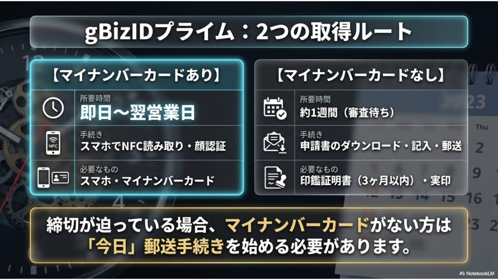 Q:gBizIDの取得にどのくらいかかる? A:マイナンバーカードがあれば即日〜翌営業日。郵送の場合は約1週間かかります。締切に間に合わせるなら、早めの手続きが必須です。