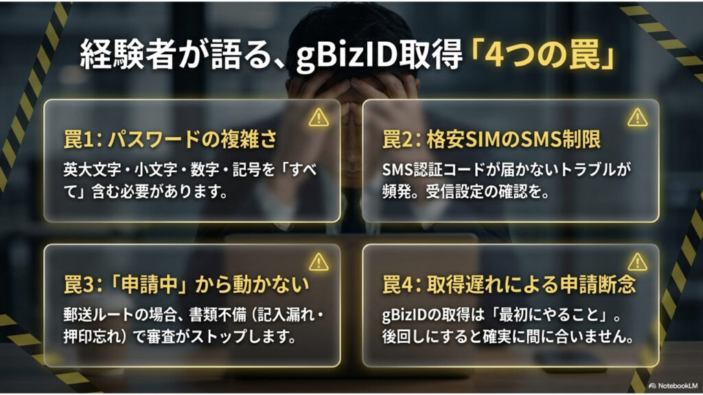 • 申請が遅れて締切に間に合わない:実際にこのパターンで申請を断念した事業者さんを何人も見てきました。gBizIDの取得は「最初にやること」です