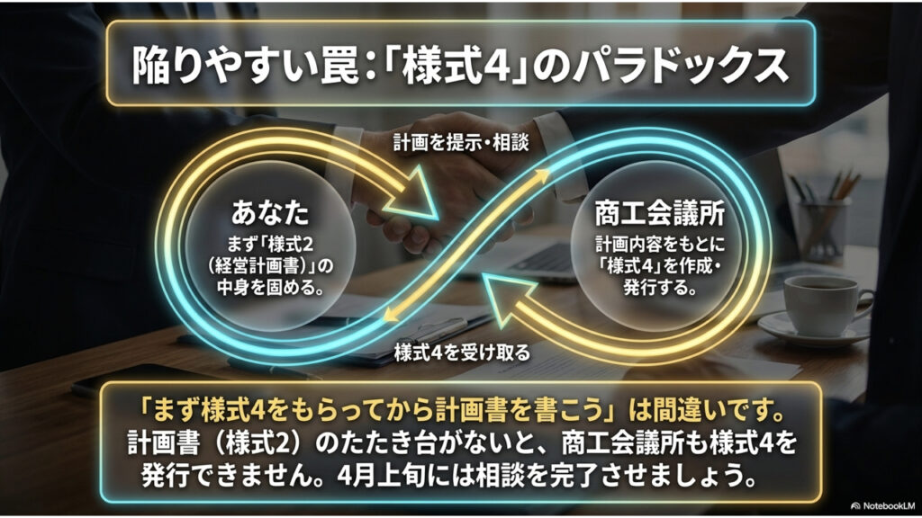 ⚠ 重要: 様式4の発行受付締切は**2026年4月16日(木)**です。4月上旬には商工会議所に相談・依頼を完了させましょう。締切直前は窓口が混み合い、発行が間に合わないリスクがあります。