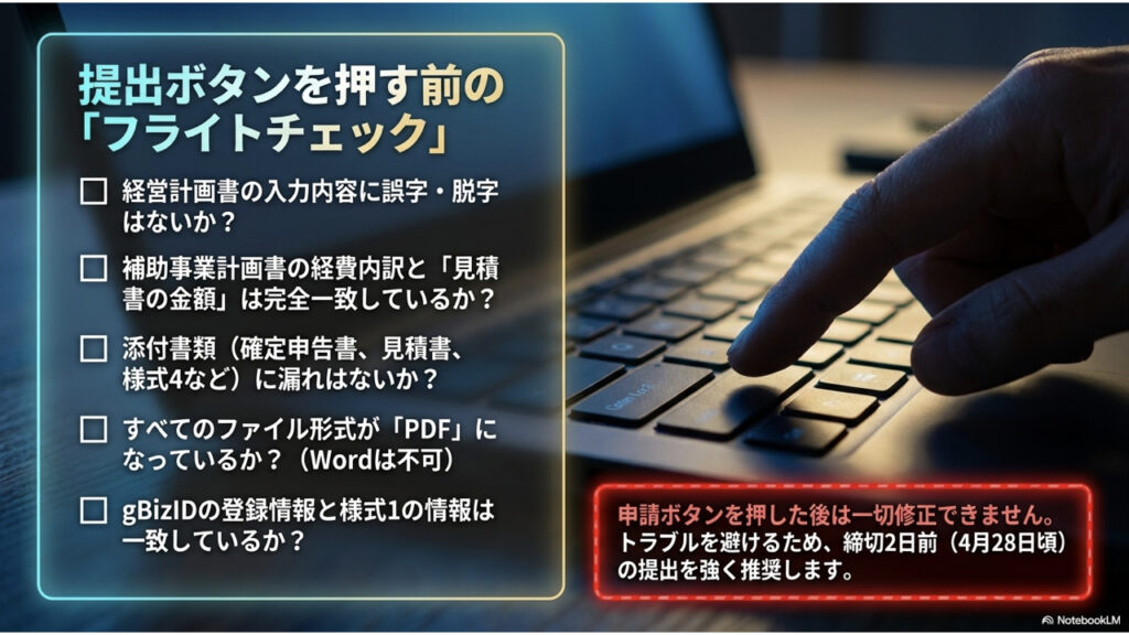 申請ボタンを押した後は内容の修正ができません。必ず提出前に内容をすべて見直してください。私のサポート経験上、締切当日にあわてて提出した方ほど、添付漏れや入力ミスが起きやすい傾向があります。遅くとも締切2日前(4月28日頃)までの提出をおすすめします。