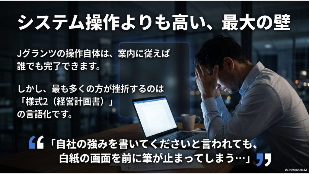 Jグランツの操作は画面の案内に従えば進められますが、様式2(経営計画書)と様式3(補助事業計画書)は自分の事業の強みや方針を言語化する必要があります。「自社の強みを書いてください」と言われても、すぐには言葉にできないものです。