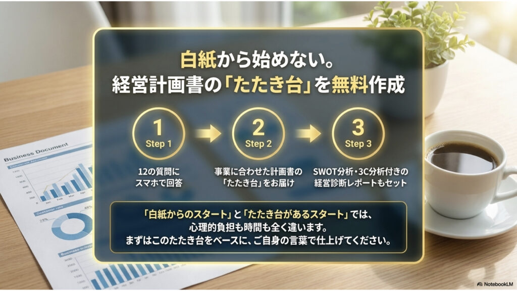 書き方を調べる時間がない方は、12の質問に答えるだけで経営計画書のたたき台を無料でお届けしています。 → 無料で計画書のたたき台を受け取る