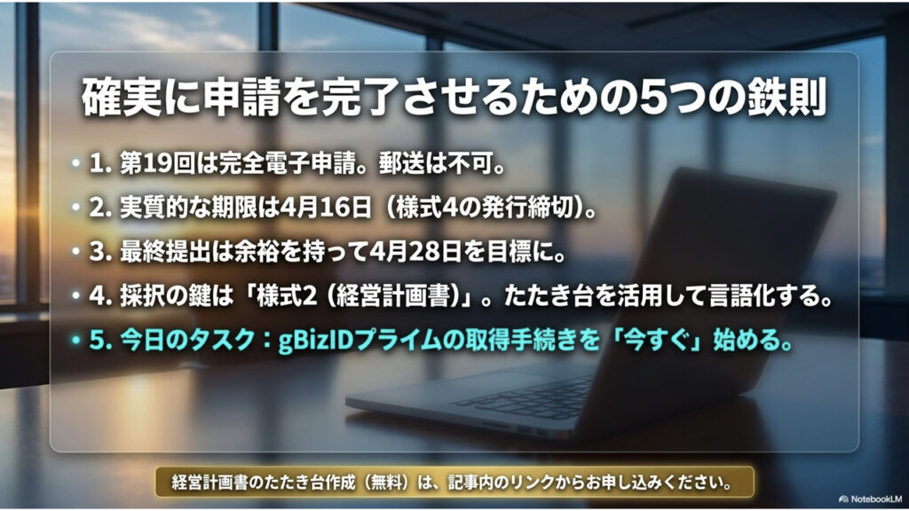 第19回の申請受付締切は2026年4月30日(木)17:00です。 gBizIDの取得がまだの方は、今すぐ手続きを始めてください。経営計画書の書き方に不安がある方は、まずたたき台から始めるのが最短ルートです。